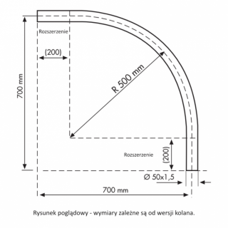 - Długość odcinków prostych na obu końcach kolana: 200 mm (standardowo), 100 / 150 mm (w przypadku mniejszych średnic)